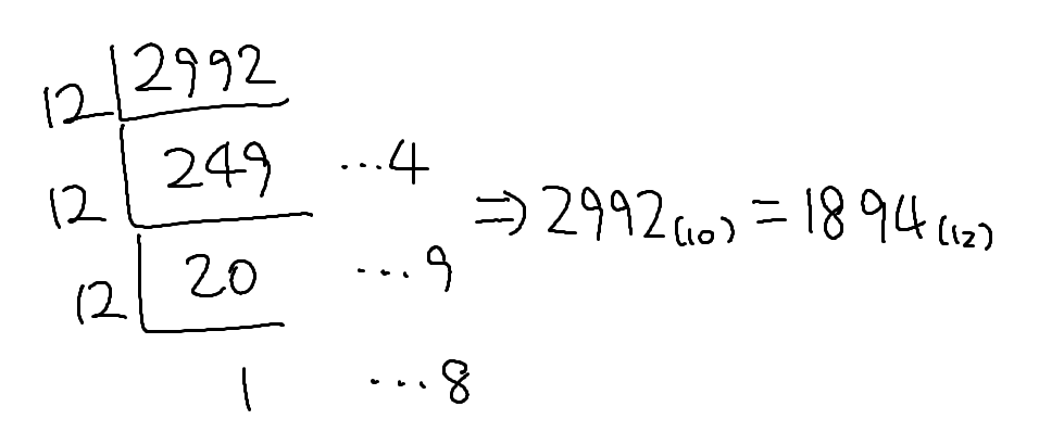 예를 들어 문제의 2992를 12진법으로 변환할 때는 다음과 같이 연산을 수행하면 된다.